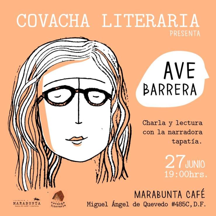 La noche del 27 de junio, la narradora y escritora Ave Barrera inaugura el ciclo de charlas y lecturas Covacha Literaria, en Marabunta café, ubicado en avenida Miguel Ángel de Quevedo 486, en Villa Coyoacán.