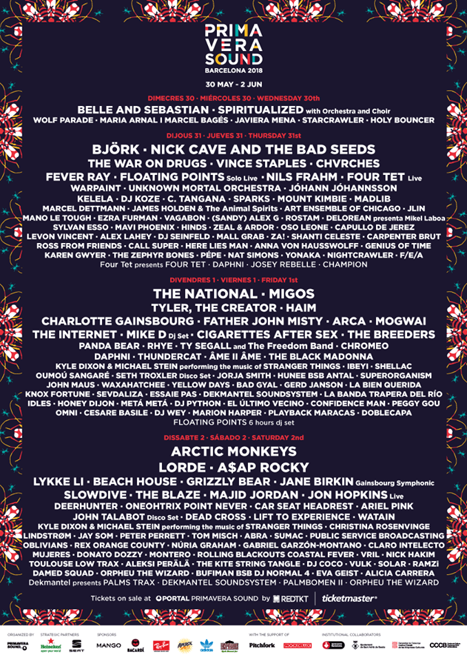 Después de varios meses de espera, el festival de Barcelona, Primavera Sound anunció su line-up 2018. Dentro de los principales nombres están: Björk, Nick Cave and the Bad Seeds, The National, Artic Monkeys, Lorde, A$AP Rocky, The War on Durgs, HAIM, Charlotte Gainsbourg, Arca, Mogwai, Lykke Li, The Breeders, y otros más.