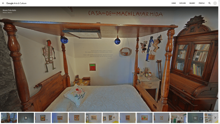 Dentro de la serie de innovaciones que Google Arts & Culture ha desarrollado para experimentar el arte de una manera distinta, se encuentran los recorridos virtuales de Street View que se podrán realizar por el Museo Frida Kahlo, donde pasó gran parte de su vida; Museo Dolores Olmedo, en el que podrás disfrutar de la colección más completa que existe en el mundo sobre la pintora, y el Museo Casa Estudio Diego Rivera y Frida Kahlo, lugar que los artistas habitaron por varios años, entre otros.