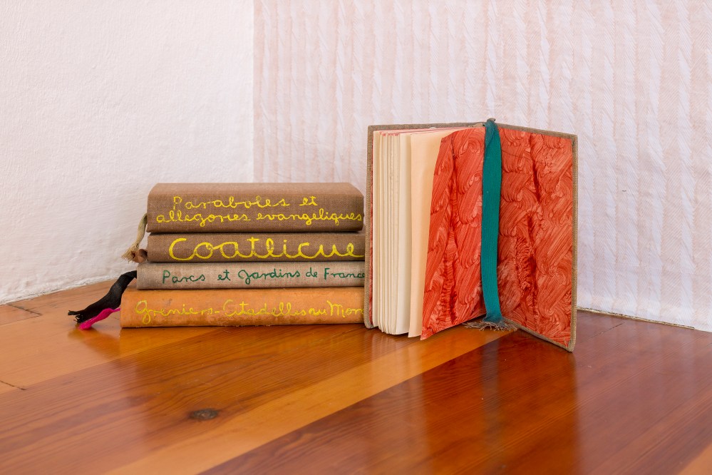Dispuestos en las habitaciones de la casa encontramos cinco conjuntos cromáticos, las Practice Pieces (Color Charts) (2019), hechos con terciopelos de seda teñidos a mano. Inspiradas por los sistemas de muestreo de color utilizados para la conservación de textiles, estas piezas se inscriben en el interés de larga data que ha tenido Yto Barrada por los materiales educativos, sus plataformas y estructuras. Tanto en la historia de México como en la de Marruecos, ha existido desde la antigüedad la producción de tintes naturales con materiales orgánicos como la cochinilla, el añil y el púrpura tirio, entre otros.