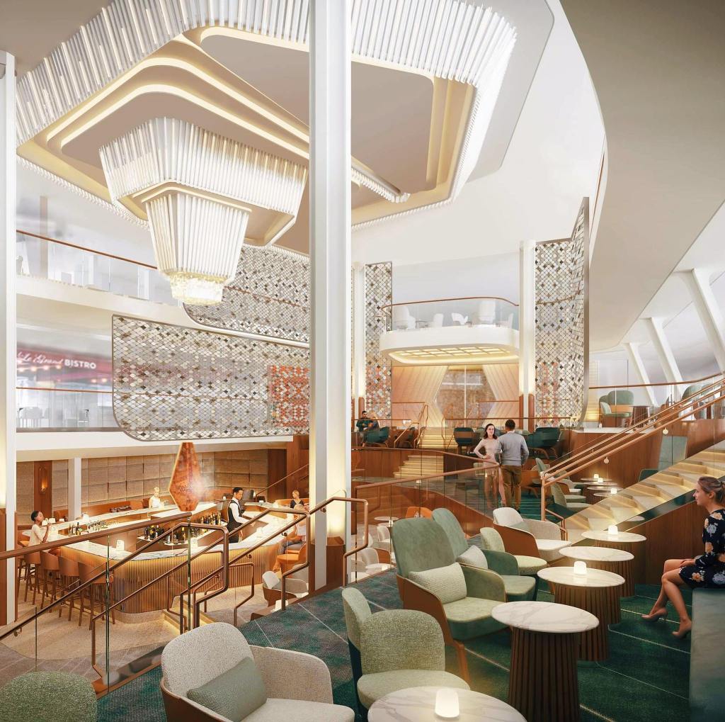 - Grand Plaza rediseñada audazmente que abarca tres cubiertas, creando un espacio interior aireado y abierto;