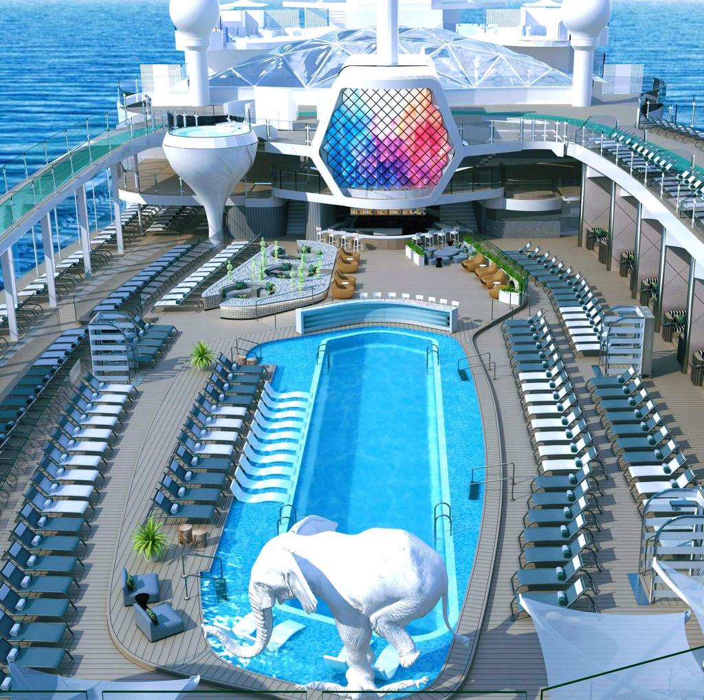 La cubierta principal abierta, 40 por ciento más grande que en los barcos anteriores de la serie Edge, cuenta con una enorme terraza al aire libre diseñada por Hoppen y con la incorporación de Wright de dos espectaculares piscinas infinitas a dos metros en voladizo en el costado del barco, que llevan a los huéspedes más allá de la orilla del agua.