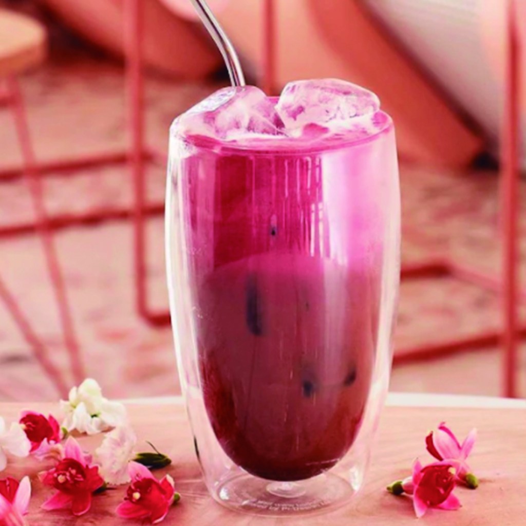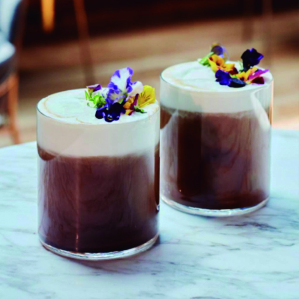 - Agregar cuidadosamente el cacao en polvo sobre la superficie de la bebida y por último los pétalos de flor comestible. Compartir y disfrutar.
