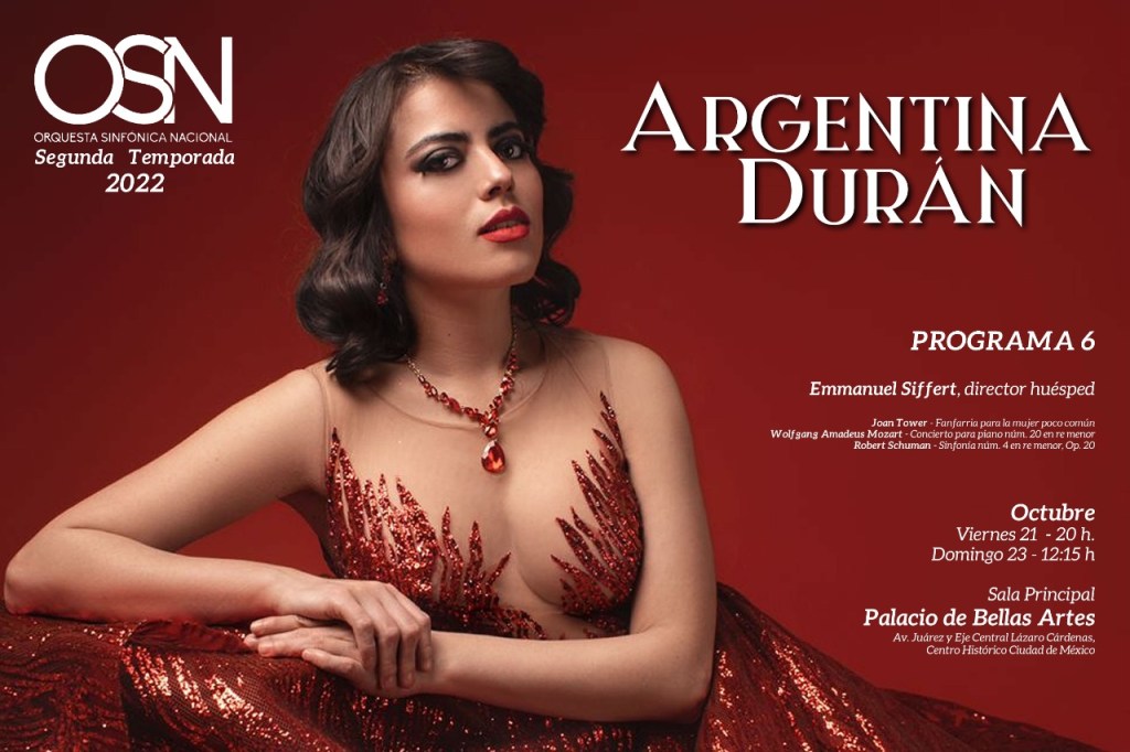 Después de haberse presentado con rotundo éxito en las ciudades de Quito en Ecuador y Pasto en Colombia, la Maestra Argentina Durán se alista para ofrecer este 21 y 23 de octubre un gran concierto en la sala principal del palacio de Bellas Artes como solista de la Orquesta Sinfónica Nacional.
