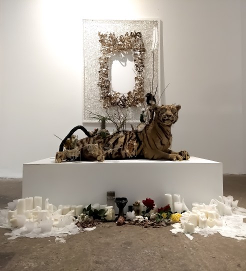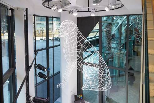 Una vez estando en el segundo piso, el marco pintado nos da la bienvenida a la exposición La deriva de un gesto post- romántico compuesta por dos salas panorámicas que generan inevitables reflexiones sobre nuestro estilo de vida enfocada en el consumismo inconsciente, social e individual y su relación con el cuidado de la naturaleza y nuestro ecosistema. Para ello observamos el proceso de degradación de una botella de plástico y el impacto medioambiental que conlleva, los residuos de componentes no degradables encontrados en un mamífero que los ingirió, dichos desechos materiales son encontrados en mar abierto, o bien la duda ejercida en los procesos de la generación de plásticos como parte de la evolución tecnológica que, contraproducente a la practicidad de la nueva era digital, expone y cuestiona el beneficio humano versus el lugar que nos es otorgado como hogar y debemos preservar y respetar para nosotros, para las generaciones venideras: el planeta Tierra. Exposición de de Hugo Martínez-Tormo. Hasta el 16 de junio 2019.