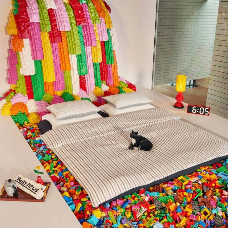 Dentro de una de sus habitaciones, se encuentra una cama que flota sobre una piscina de ladrillos que está bañada por una cascada de seis metros construida a base de piezas de LEGO. Todo lo demás está hecho del mismo material: las lámparas, el despertador, la televisión, un libro de cuentos para dormir, los sillones ¡e incluso el gato que vigila la puerta!